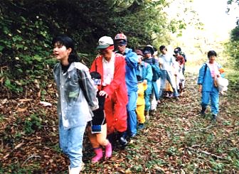途中「目かくしイモムシ」をしながら聴覚や触覚、嗅覚で自然を感じてみる。